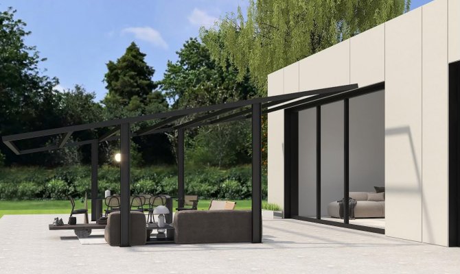 Ponujamo samo konstrukcijo, ki si jo lahko po svojih željah prilagodite. Čez ohišje lahko napnete platno, lahko celotno streho prekrijete z materiali, ki so vam všeč in nudijo zaščito.